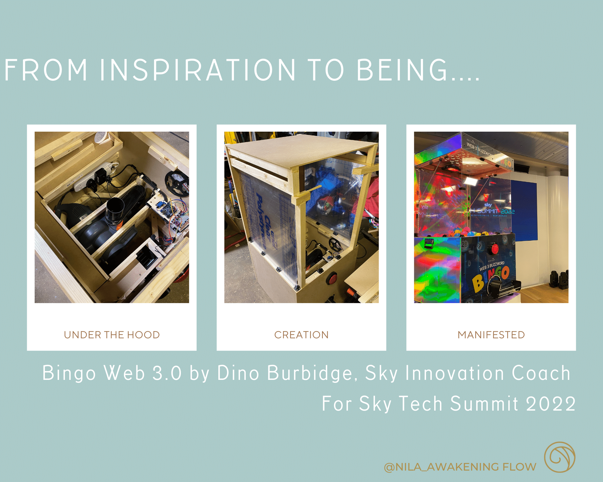 Taking a leap and creating were the sentiments reflected by Dino Burbidge, Innovation and Inspiration Coach for Sky Labs. He constantly follows his inspirations through to actual fruition, or in one case, the woodwork table. While interviewing him, he was in the process of making a (nearly) 3-foot tall bingo device that automatically spits out numbers. He was inspired by an idea and wanted to bring it to life for his audience at the 2022 tech Sky Summit so they could play Bingo Web 3.0.